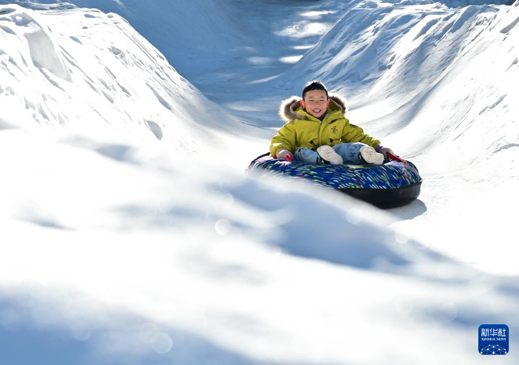 1月10日,一名小朋友在祁连县阿咪东索林海露营基地体验冰雪项目。新华社记者 齐芷玥 摄