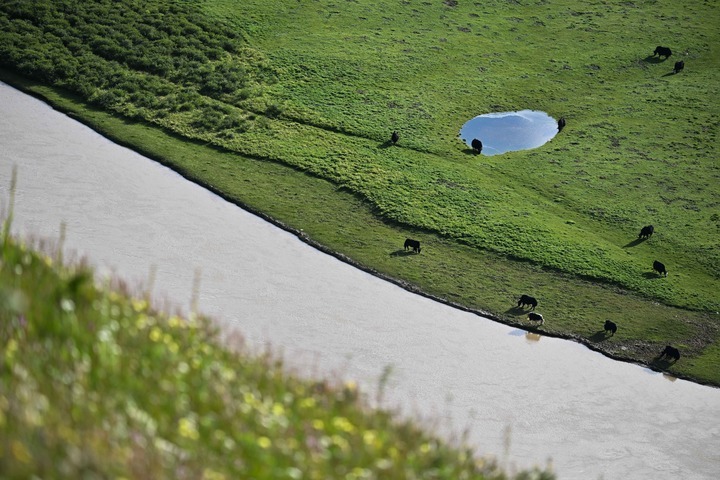 2024年7月31日,一群牦牛在青海省果洛藏族自治州达日县境内的黄河岸边觅食。新华社记者 李占轶 摄