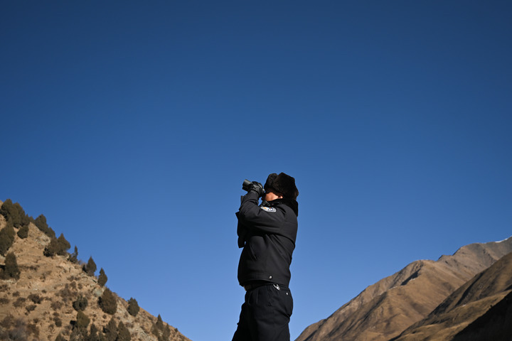 1月9日,门源县公安局浩门森林公安派出所老虎沟生态警务室的民警郭建业在用望远镜查看远处。